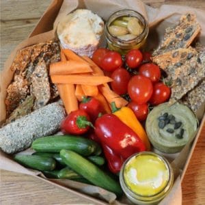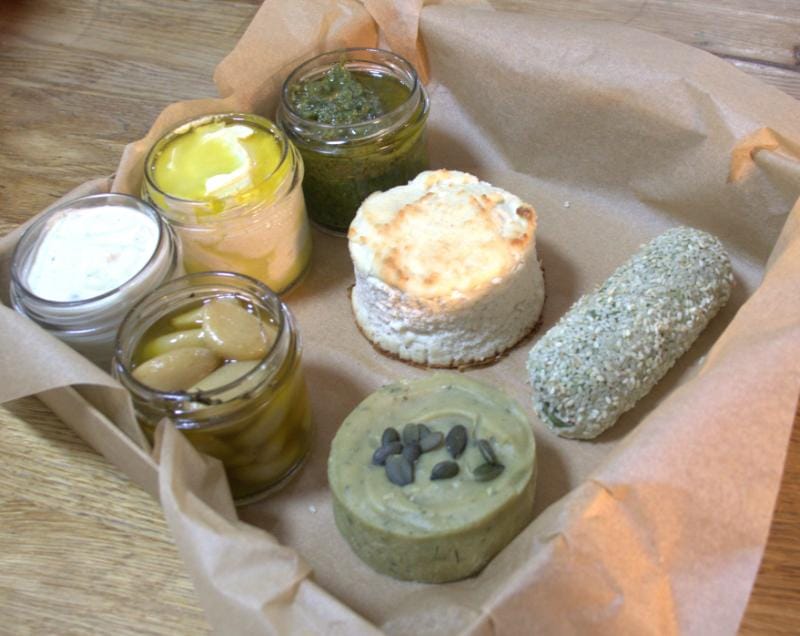 מארז מיקס גבינות וקרקרים- שמנת קשיו פסטו, לאבנה זרעי חמניה ושמן זית, רול זרעי דלעת ובזיליקום מצופה שומשום, פטה שקדים אפויה, גבינת קשיו קשה מיושנת, שום קונפי ופסטו בזיליקום זרעי דלעת שמן זית.